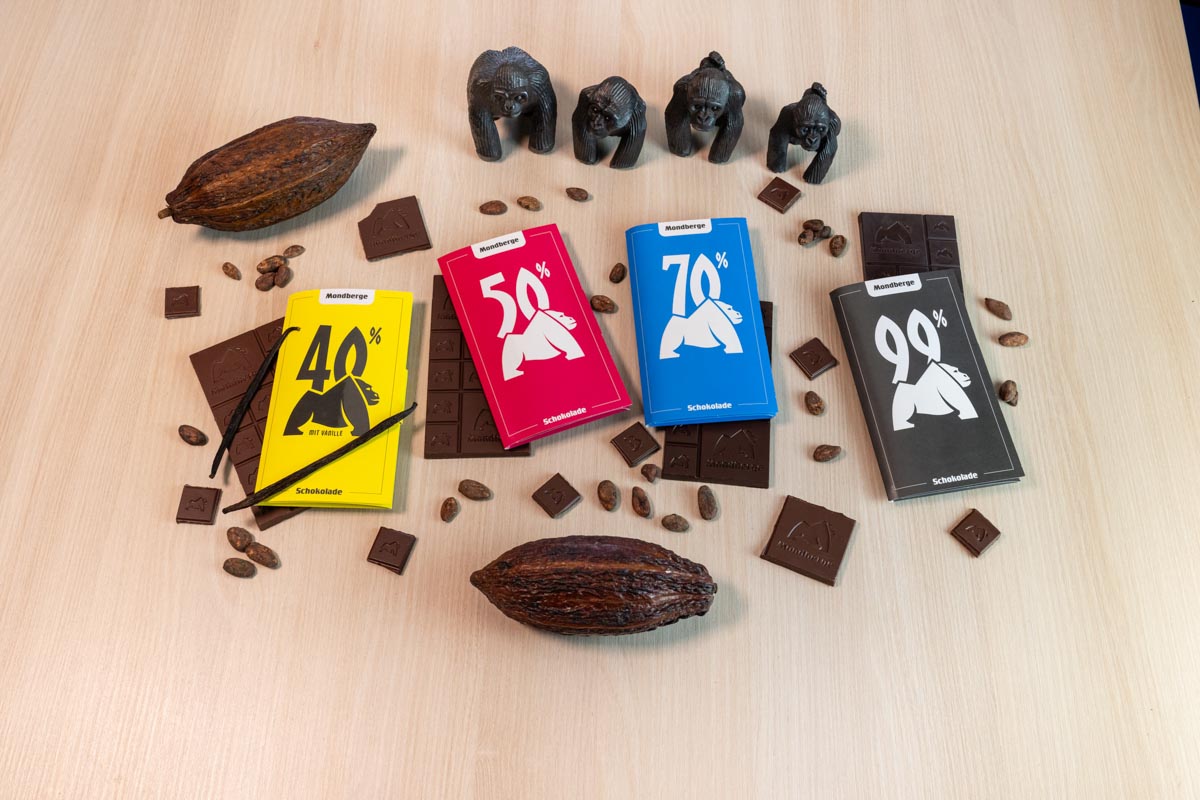 Auch in den kommenden Jahren werden wir gemeinsam mit der Schokoladen-Manufaktur CAHUA unsere Mondberge-Schokolade anbieten. Ab September 2026 wird es zusätzlich auch reine 100%ige Trinkschokolade geben und wenn alles klappt, hoffentlich auch kleine Schokoladen-Gorillas. Mit dem Kauf jeder Tafel wird den Menschen vor Ort automatisch geholfen, da sie ja schon durch den Kakaoanbau verdienen, aber auch die Mondberge-Projekte in Uganda werden unterstützt, da immer ein Teil unserer Erlöse gespendet wird.